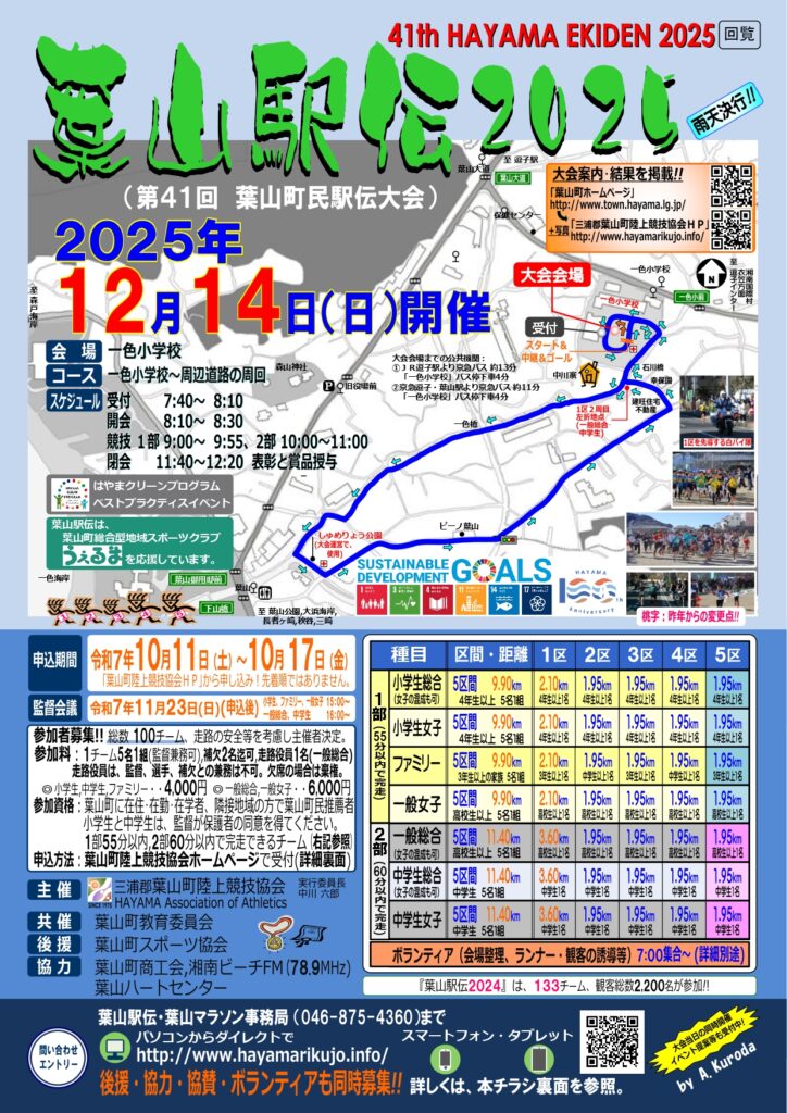 12月14日に一色小学校周辺公道で、開催される葉山駅伝2025の参加申込みは、10月11日(土)~17日(金)まで受け付けられた。